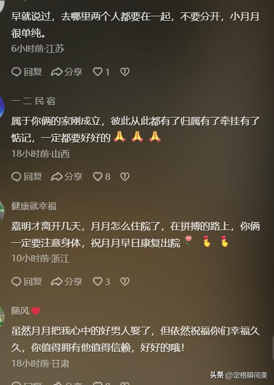 为了求证,不少粉丝朋友纷纷艾特丈夫李嘉明,希望他能出面澄清原委。当天晚上,正在外地演戏的李嘉明顾不得剧组挽留,连夜驱车到了青岛某医院,并用“小号”发出了一段照片,画面中妻子小月月躺在病床上,头发凌乱躺在病床上,满脸憔悴,厥着小嘴唇,眼神里满满地“怨恨”。看身旁住院环境很一般,挤在多人间里,大背头电视机,让人看着十分心疼。
