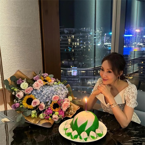 林文龙和女儿还为郭可盈准备了一大束鲜花和造型别致的寿桃蛋糕,真的好用心呀。郭可盈和鲜花、蛋糕拍合影,话说这个状态真的太好啦,漂亮有气质,脸上看不到岁月痕迹,真的不像55岁呀,保养得超好。