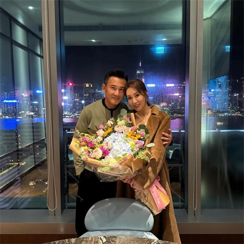郭可盈和林文龙还拍了合影,林文龙搂着老婆,郭可盈抱着鲜花依偎在老公身边,夫妇俩相拥一起,尽显恩爱甜蜜。