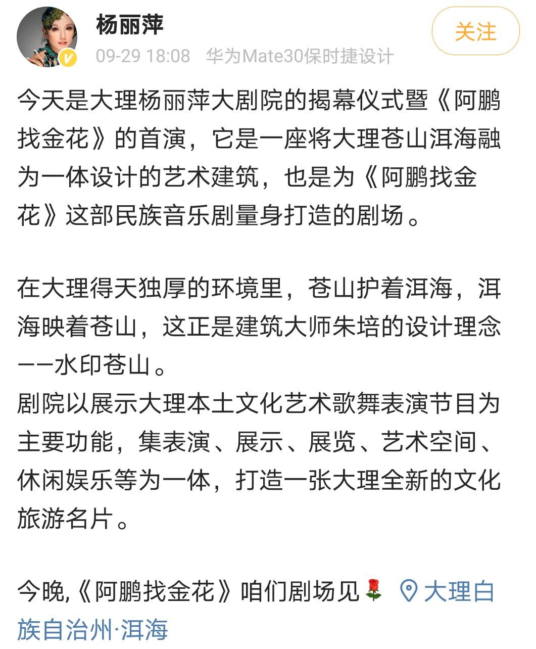 杨丽萍在凭借孔雀舞名声大噪后,一直在努力创作新的舞蹈作品,9月29日,她的新作《阿鹏找金花》进行了首演,杨丽萍也在自己的社交平台上进行卖力宣传。不仅如此,当天还是大理杨丽萍大剧院的揭幕仪式,不得不让人感叹杨丽萍的影响力和财力,居然能有一个自己的剧院。
