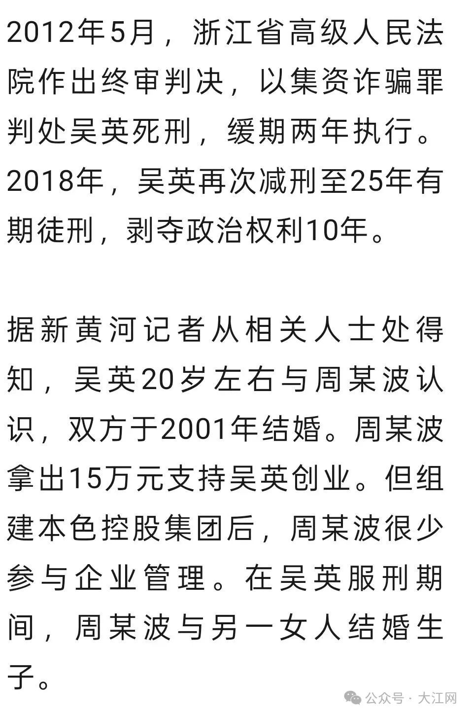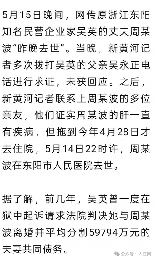 网传吴英狱中起诉离婚的丈夫周某波去世,亲友证实:在医院病逝