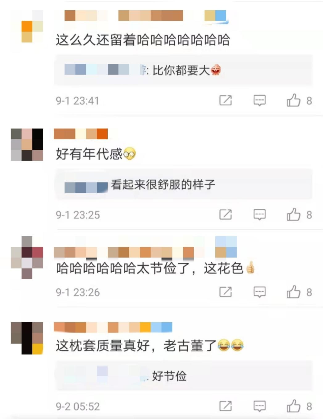 网友看了马伊琍晒出的枕套,有人直呼好有年代感,这是老古董了,也有人夸奖她们好节省。还有网友调侃说,这个枕套比有些粉丝的年龄都大。
