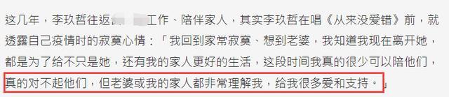 这次他在台北举行演唱会,老婆并未露面。李玖哲唱歌时突然痛哭了起来,称他这些年很少陪伴家人,妻子总是很支持他工作,无怨无悔,这些让他内心愧疚不已。