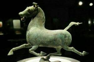 现藏于甘肃博物馆,又名“马超龙雀”、“铜奔马”,为东汉青铜器,1969年出土于甘肃省武威雷台墓。东汉时期镇守张掖的军事长官张某及其妻合葬墓中出土,现藏甘肃省博物馆。奔马身高34.5厘米,身长45厘米,宽13厘米。