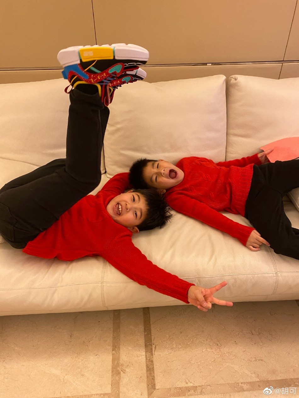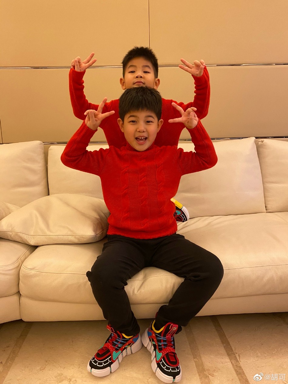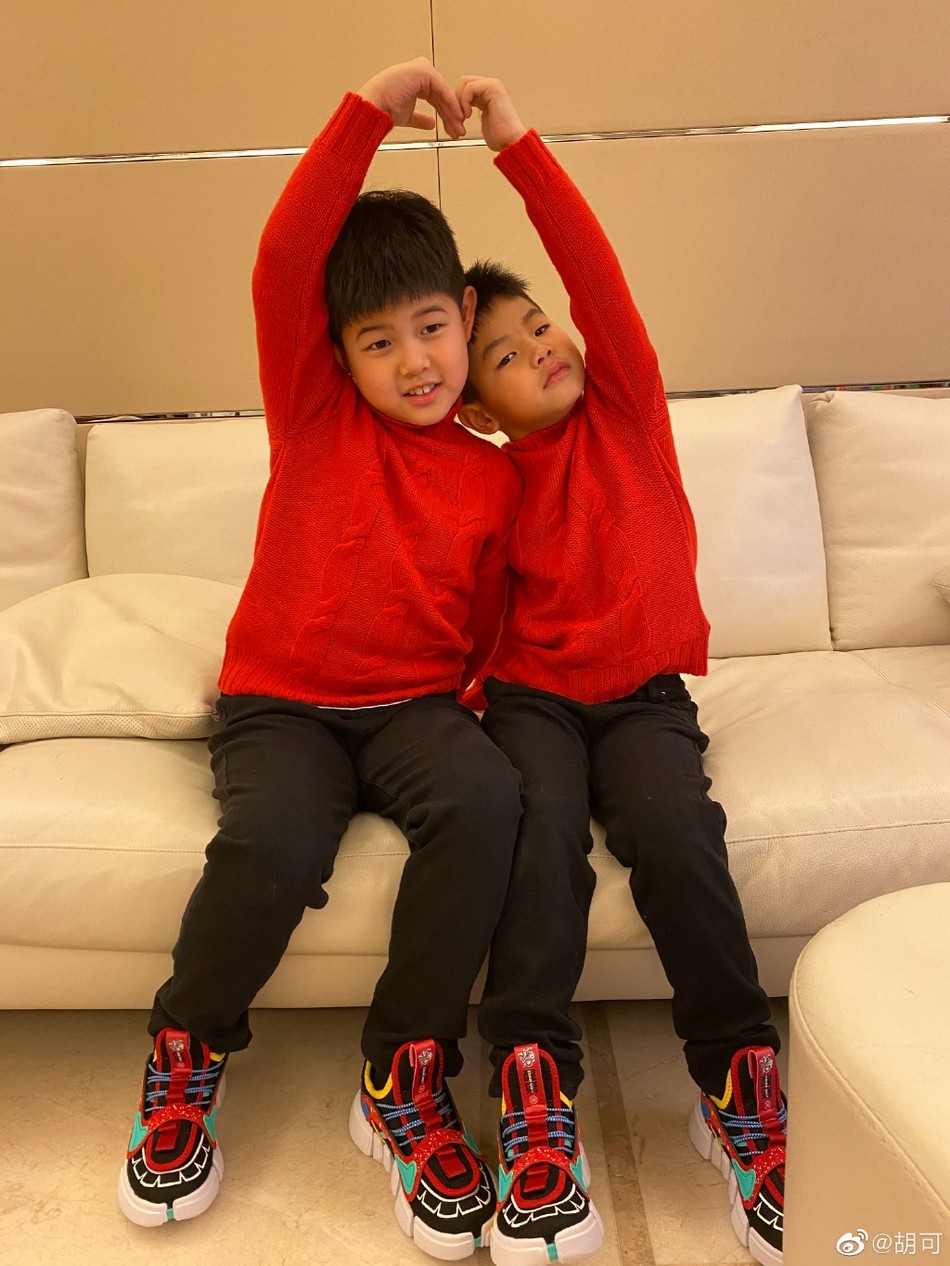 新浪娱乐讯 1月30日,胡可在微博晒出一组儿子安吉和小鱼儿的近照,并发文称:“希望一切好起来。”照片中,安吉和小鱼儿身穿同款红色毛衣、黑裤子及鞋子,在沙发上搞怪自拍。