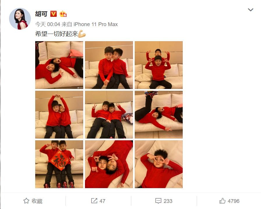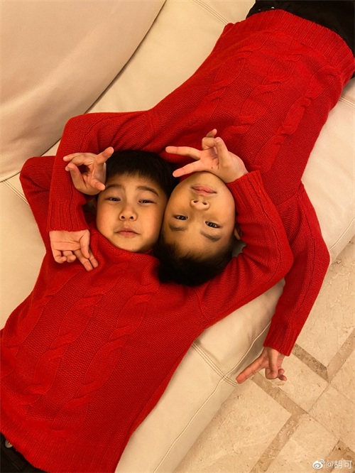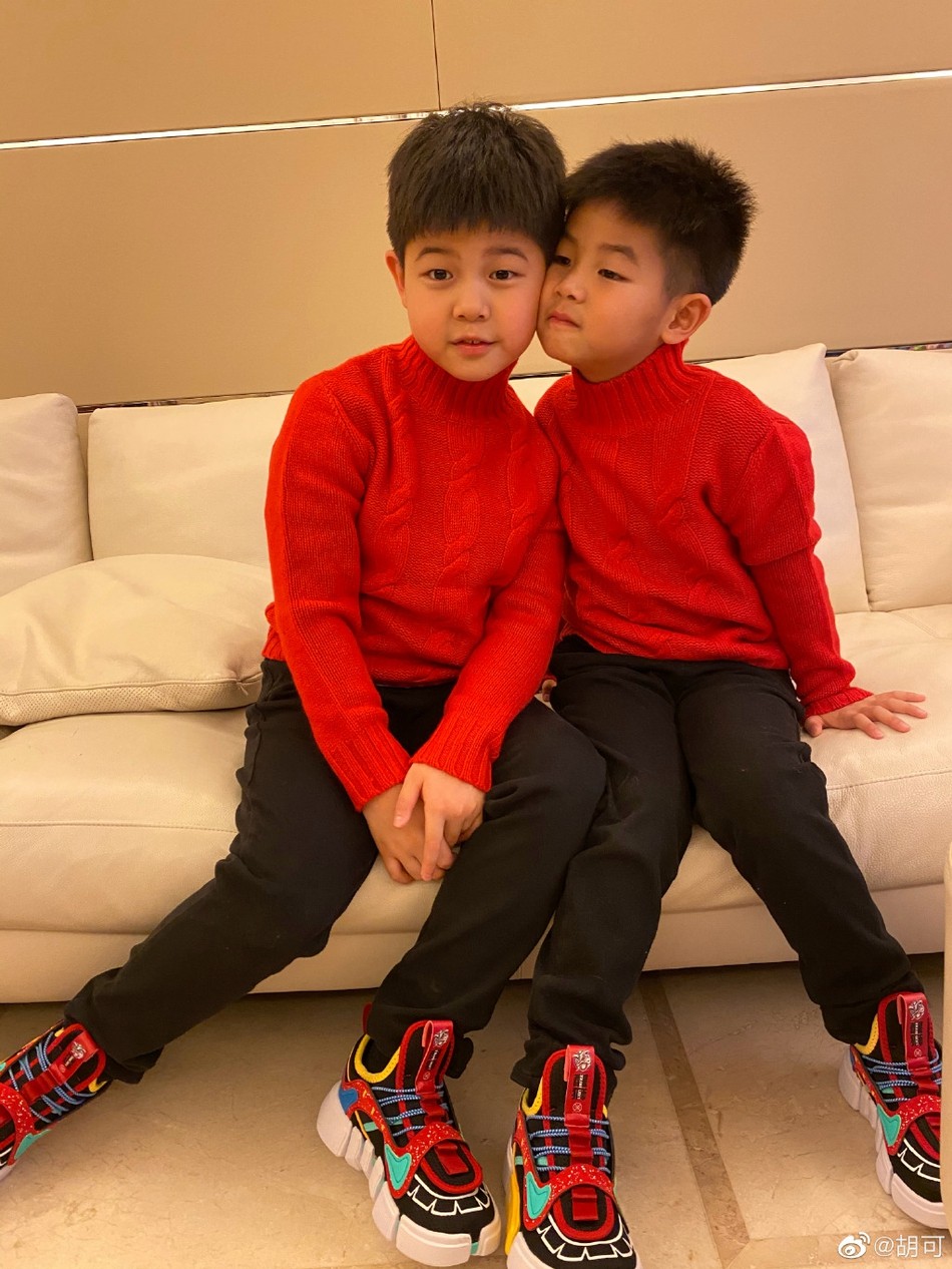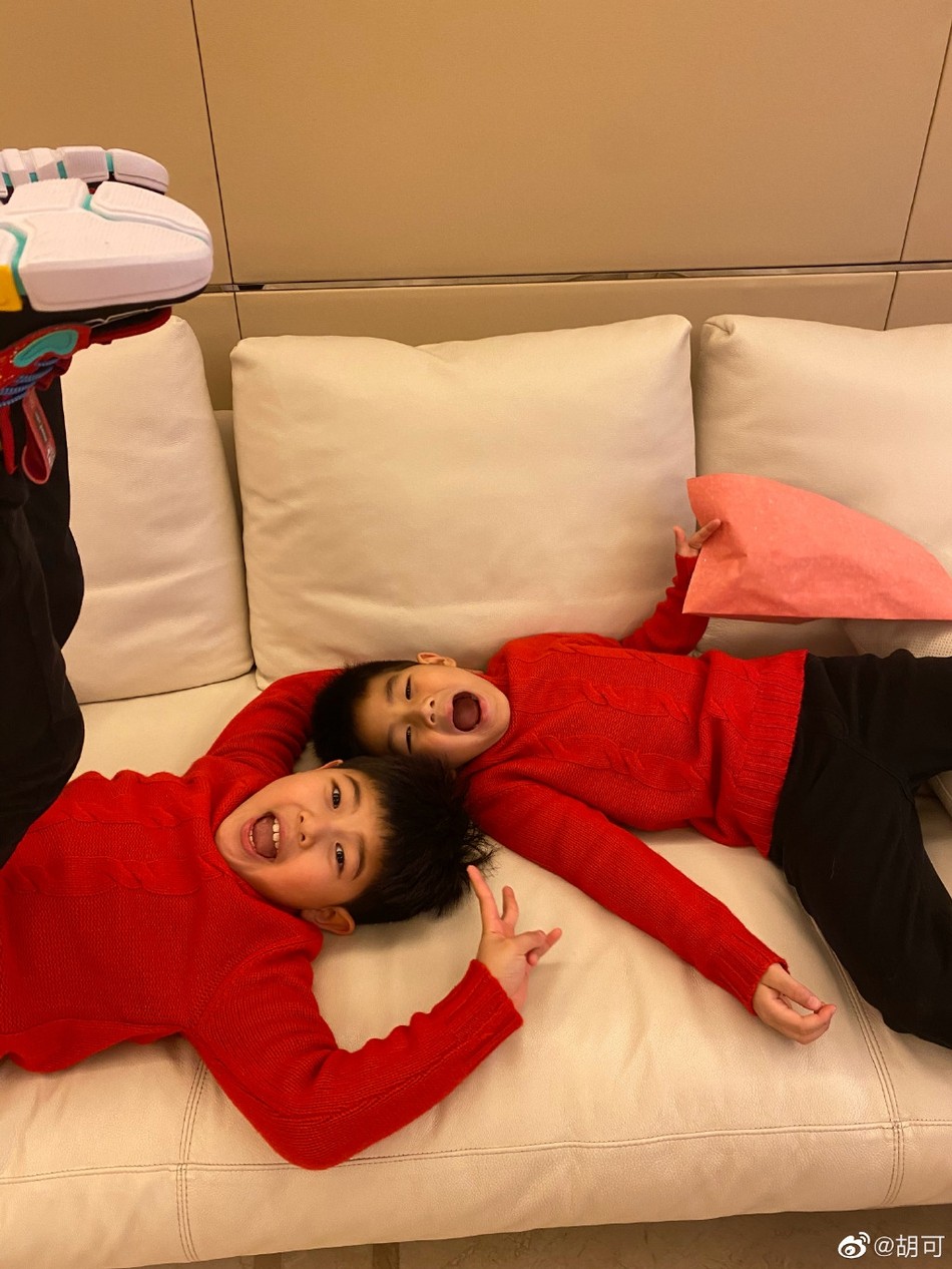 新浪娱乐讯 1月30日,胡可在微博晒出一组儿子安吉和小鱼儿的近照,并发文称:“希望一切好起来。”照片中,安吉和小鱼儿身穿同款红色毛衣、黑裤子及鞋子,在沙发上搞怪自拍。