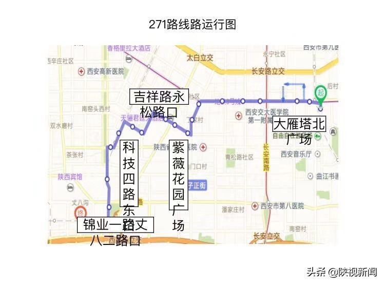 271路去程:由锦业一路丈八二路口发车至大雁塔北广场原线路不变。回程:由大雁塔北广场发车,经西影路后,改经雁塔北路、育才路、翠华北路至小寨东路恢复原线路运行。新增:雁塔路育才路口、翠华路育才路口2个站点。线路调整后首班6:30,末班20:30,实行无人售票空调车投币两元可刷卡票制。