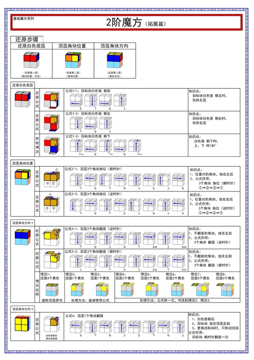 3、拓展篇有7个公式,在熟练基础篇后,建议再学习拓展篇的还原公式,可为以后学习还原三阶或更多魔方,打下更好的基础。