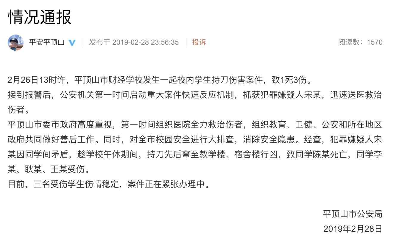 河南省平顶山市公安局官方微博消息,2月26日13时许,平顶山市财经学校发生一起校内学生持刀伤害案件,致1死3伤。