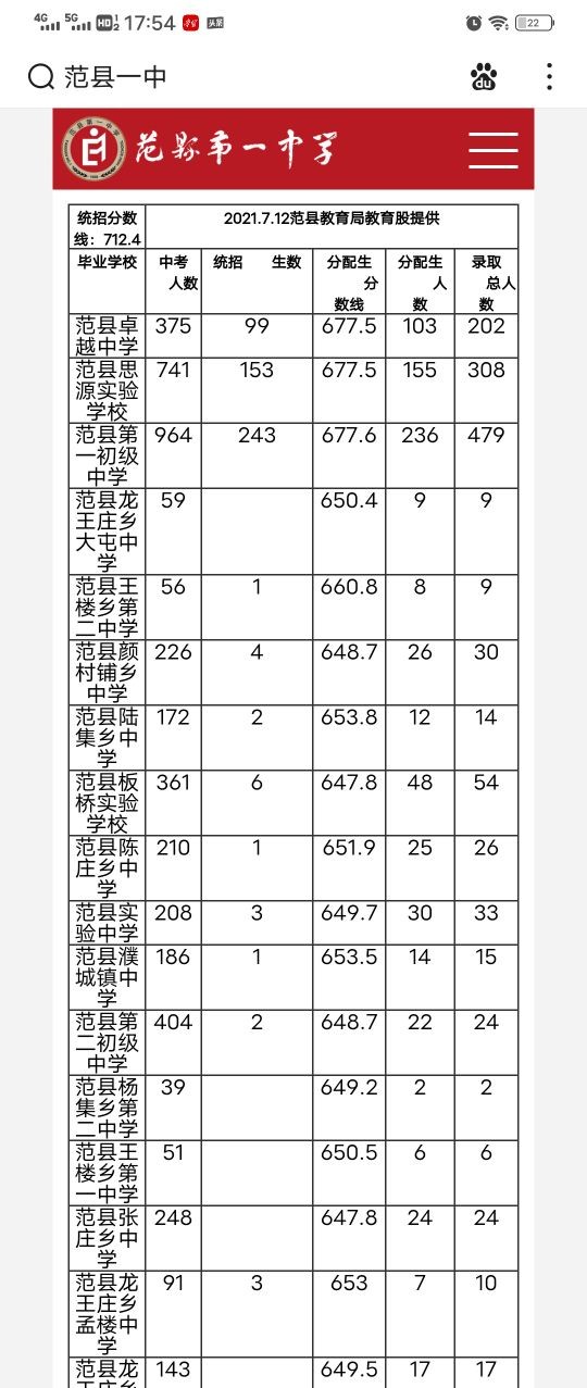 2021年濮阳市范县一中录取分数线