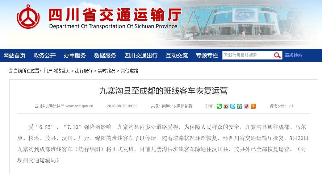 成都全搜索新闻网8月30日讯据省交通厅消息,受“6.25”、“7.10”强降雨影响,九寨沟县内多处道路受损,为保障人民群众的安全,九寨沟县通往成都、马尔康、松潘、茂县、汶川、广元、绵阳的班线客车予以停运。随着道路状况逐渐恢复,经四川省交通运输厅批复,8月30日九寨沟到成都班线客车(绕行绵阳)将正式发班。目前九寨沟县班线客车除通往汶川县、茂县外已全部恢复运营。