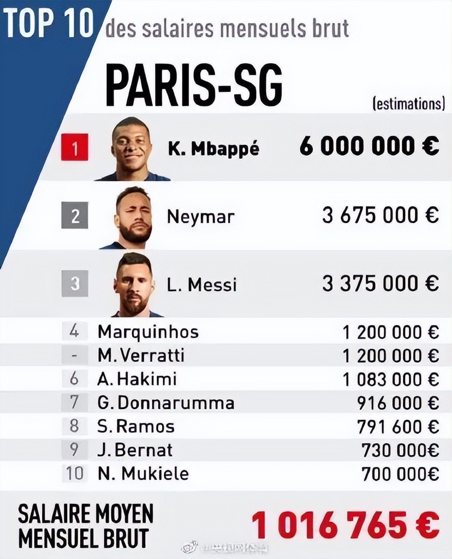 法国媒体《队报》近日公布了本赛季法甲球员税前月薪排行榜。据报道,姆巴佩在去年夏天与巴黎续约两年,使得他跻身全球收入最高球员之列。姆巴佩续约后的月薪为600万欧元,超过内马尔367.5万欧和梅西337.5万欧,折合近4500万人民币,位居队内第一。巴黎一线队球员月平均薪资101.6765万欧。