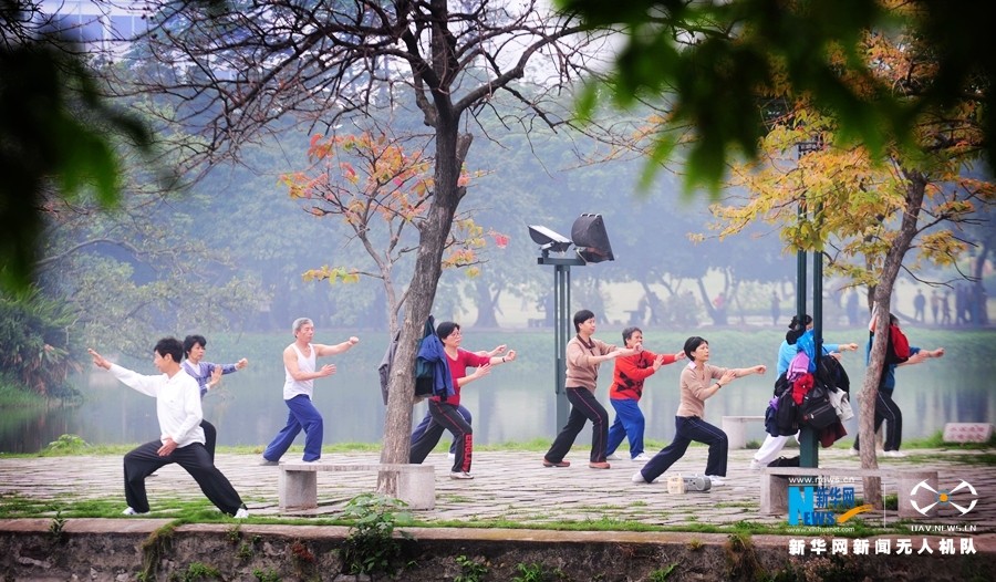 公园里晨练的市民。新华网发