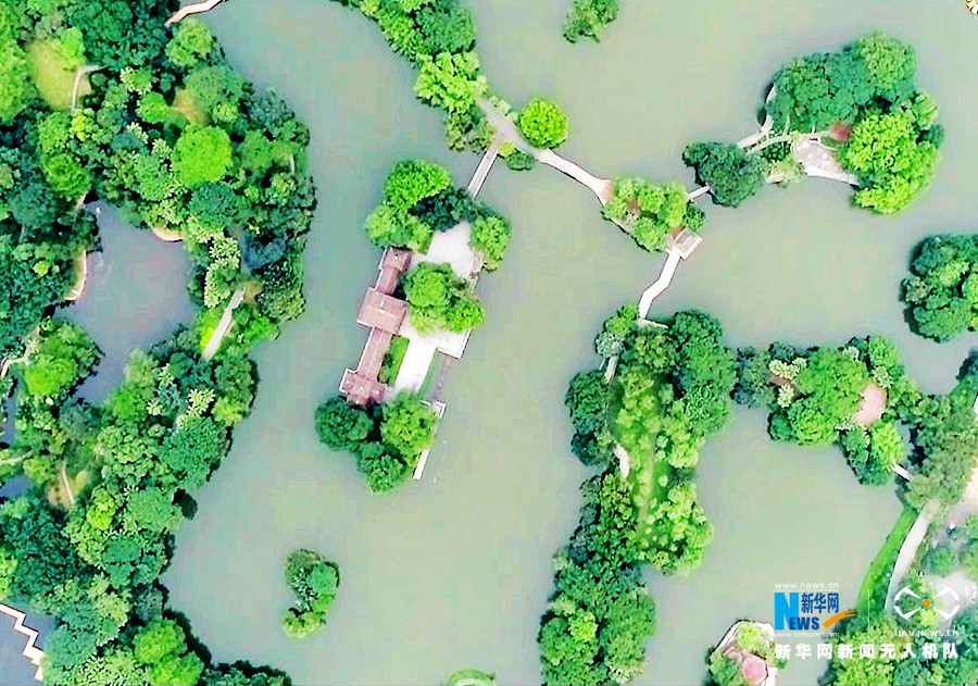 航拍视角下的公园,小桥流水、岁月静好。新华网发