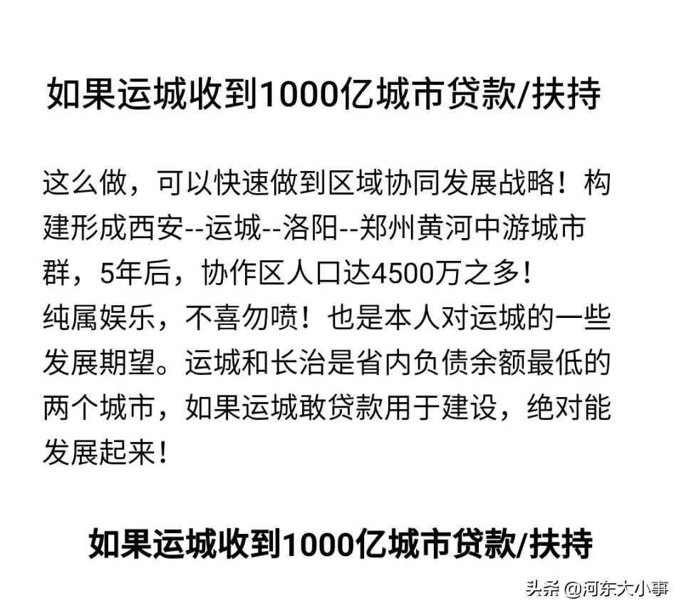 近日,小编在浏览运城城建贴吧时发现了一个特别有意思的帖子,说的是如果运城收到1000亿元城市贷款或者扶持资金的话,那么运城十五年后将会变成一个大都市,一个中心城市!