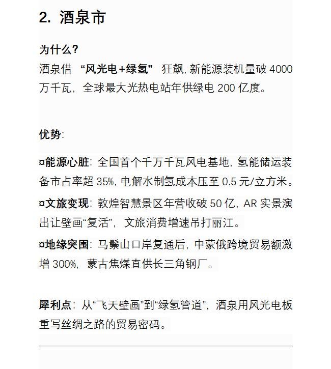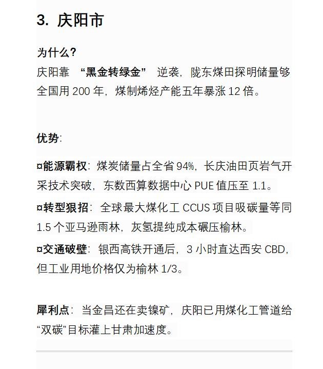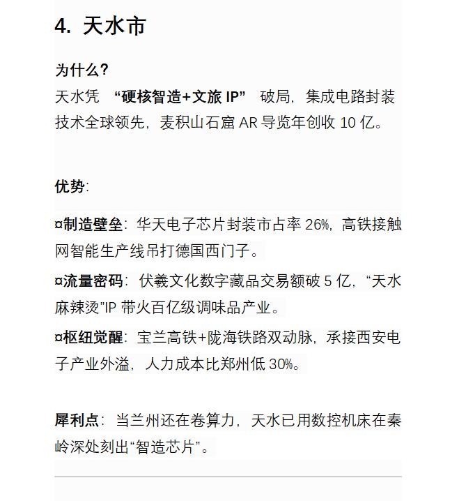 未来五年,甘肃将上演“去单极化”突围:兰州靠数字霸权统治西北,酒泉用绿氢重写丝路规则,庆阳以煤化工颠覆能源逻辑,天水凭智造撕掉西部标签,张掖借种子银行打开生态金矿。共同密码是甩开“荷兰病”、激活禀赋错位竞争——当沿海还在卷芯片时,陇原大地正用“黑科技+绿能源+古文明”组合拳,在黄河与祁连山之间劈出增长新维度。这场“山河革命”,正是西部逆袭的最野样本。