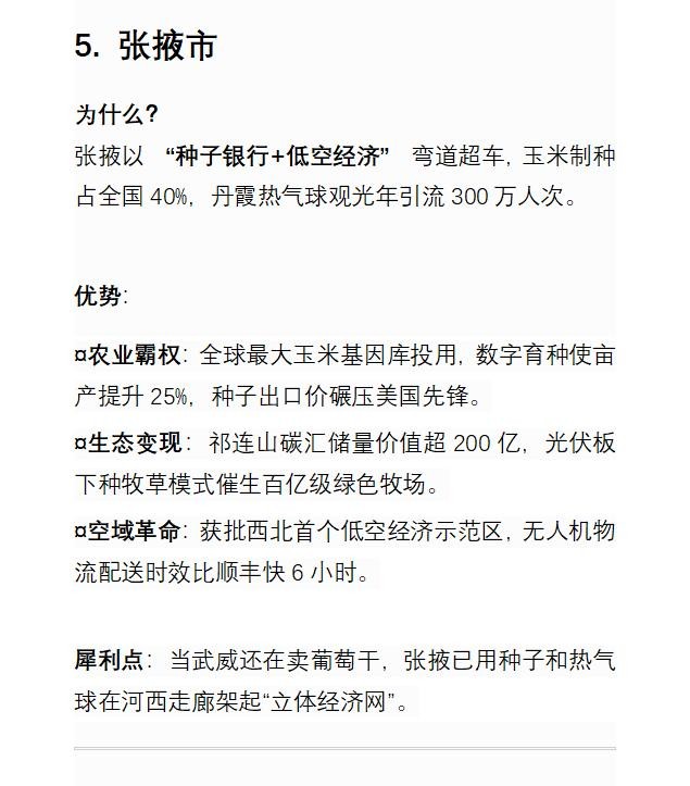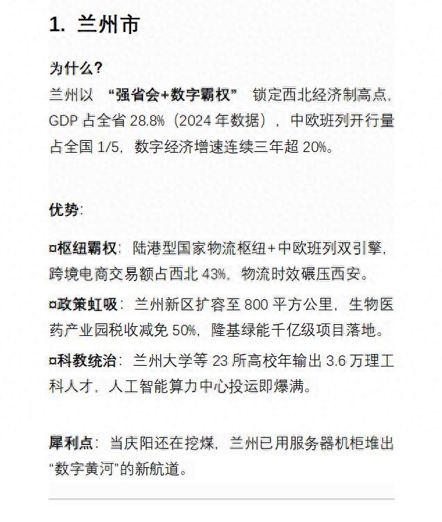 deepseek:未来5年甘肃省经济环境最好的五座城市