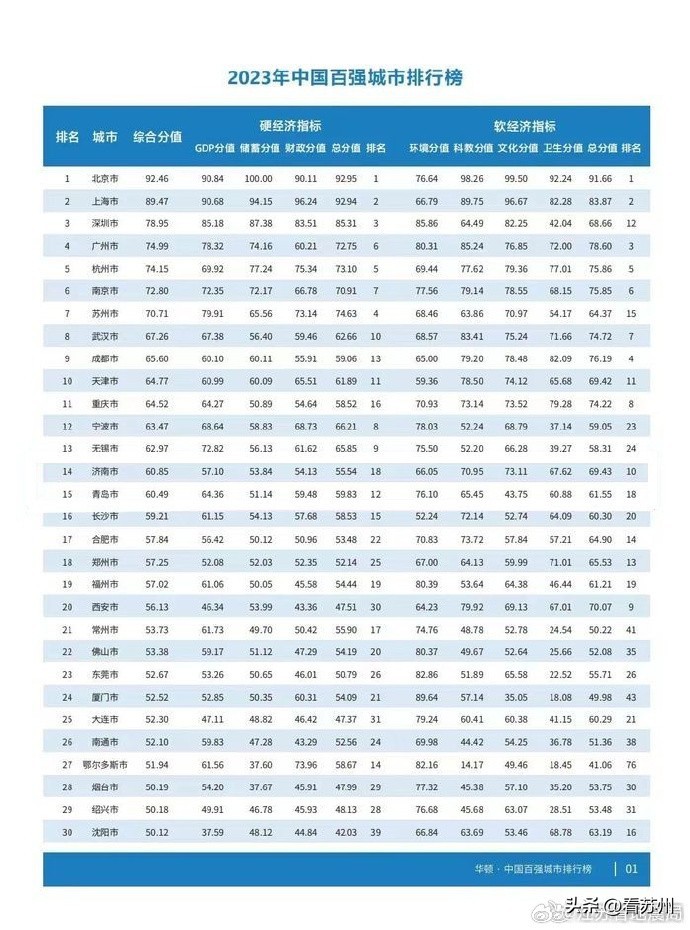 2023年中国百强城市排行榜发布,苏州位居中国百强城市榜第七