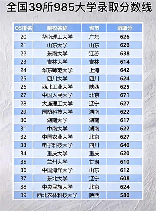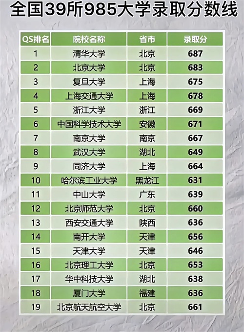 2023年全国39所985大学录取分数线是很多同学所关注的,那么2023年考985大学需要多少分?2023年985高校的录取分数线对于2024届考生来说具有非常大的参考意义。