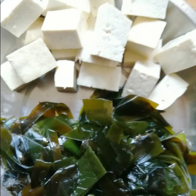 1、海带洗净切条、豆腐切块备用。