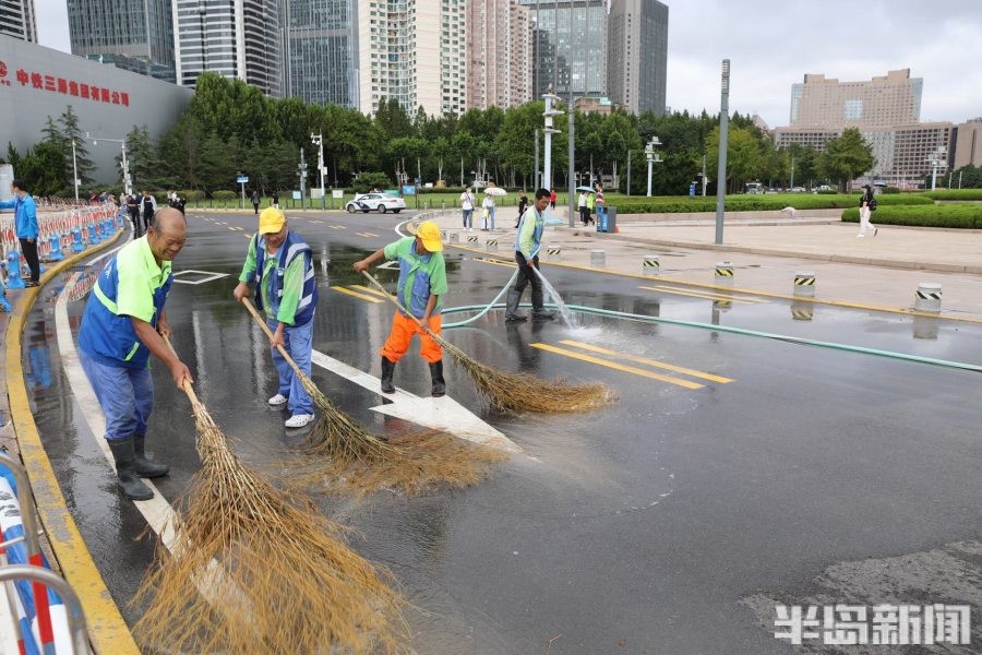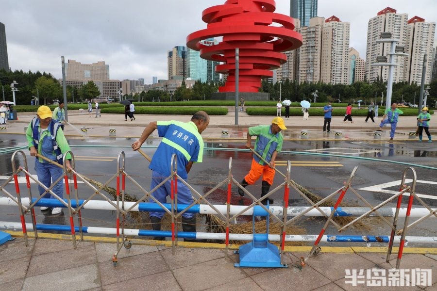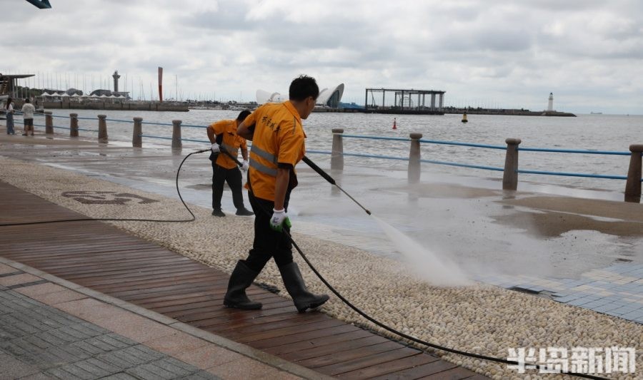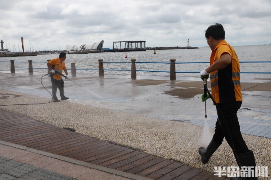 9月16日,五四广场景区,市南环卫工作人员和海滨风景管理处的工作人员在清洗景区路面。地面的海沙清理完毕后,工作人员通过高压水枪冲洗路面,美化景区的环境。