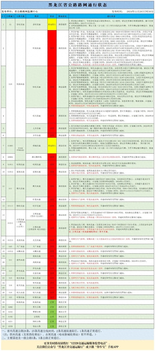 11月26日7时30分汇总路况信息:全线封闭的高速有(25条高速):吉黑高速(吉黑省界-哈尔滨段)、牡绥高速、牡复高速、建虎高速、双嫩高速、哈同高速、哈牡高速、吉黑高速(黑河-北安段)、绥大高速、大广高速、伊北高速、北漠高速、绥北高速、哈大高速、北富高速、齐甘高速、大齐高速、鹤哈高速、依七高速、鸡虎高速、密兴高速、建黑高速、哈肇高速、鹤大高速、都市圈环线,封闭。限速限行的高速有(2条高速):京哈高速、哈尔滨绕城高速,禁止七座(含七座)以上客车及危化品车辆、大件车辆运输车辆通行,限速80公里/小时。正常通行的高速有:机场高速。