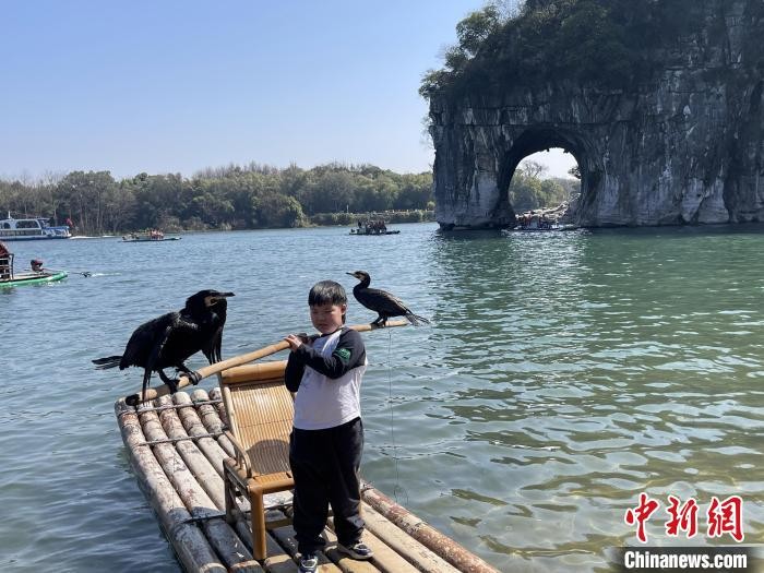 图为游客在桂林城徽象鼻山与鸬鹚合影。涂丽莎 摄
