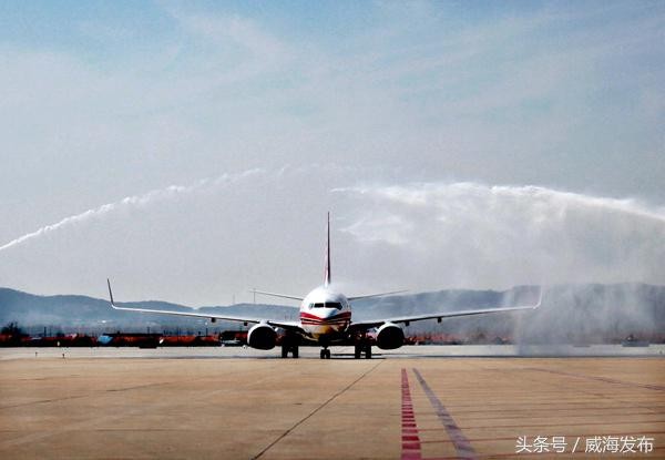 威海国际机场为首航班机举行了“水门”欢迎仪式