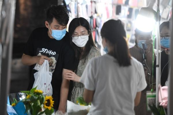 ↑6月8日,市民在杭州“吴山夜市”选购鲜花。
