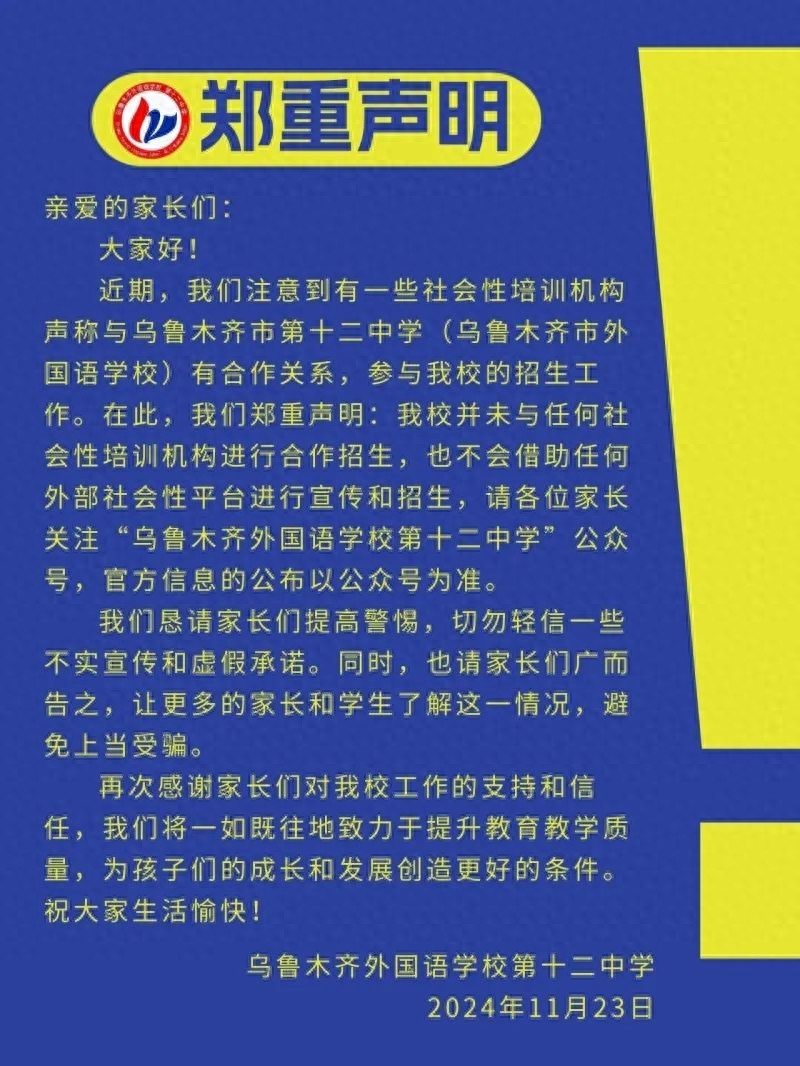 声明称,近期,学校注意到有一些社会性培训机构声称与乌鲁木齐市第十二中学(乌鲁木齐市外国语学校)有合作关系,参与学校的招生工作。为此,学校郑重声明:学校并未与任何社会性培训机构进行合作招生,也不会借助任何外部社会性平台进行宣传和招生,请各位家长关注“乌鲁木齐外国语学校第十二中学”微信公众号,官方信息的公布以公众号为准。