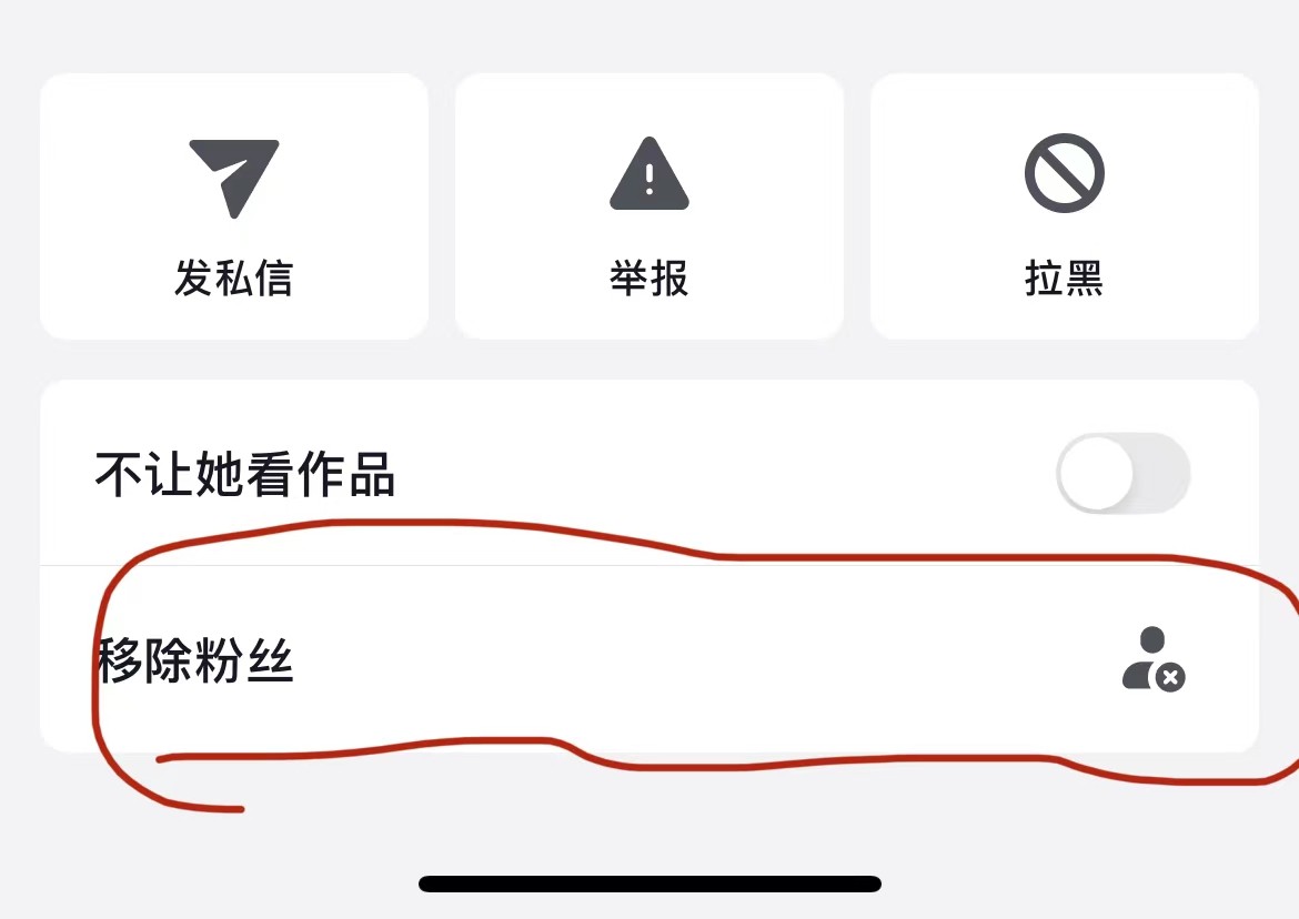 在主页这里,点一下粉丝数量,会进入到具体的粉丝列表,你所有的粉丝都在这里展现。如果你想要移除某个粉丝,就点击该粉丝最右边的“...”三个点,点击进去,这里有发私信、举报、拉黑三个功能,在这三个功能的下面,有一个移除粉丝,点击移除粉丝,这个人就从你的粉丝列表里消失了。