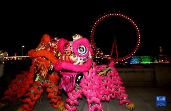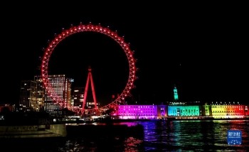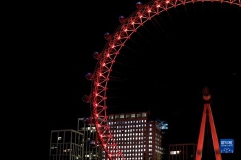 当晚,英国伦敦地标建筑、巨型摩天轮“伦敦眼”亮起红色灯光,迎接中国农历新年的到来。