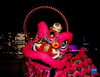 1月13日,在英国伦敦,演员在亮起红色灯光的“伦敦眼”前表演舞狮。