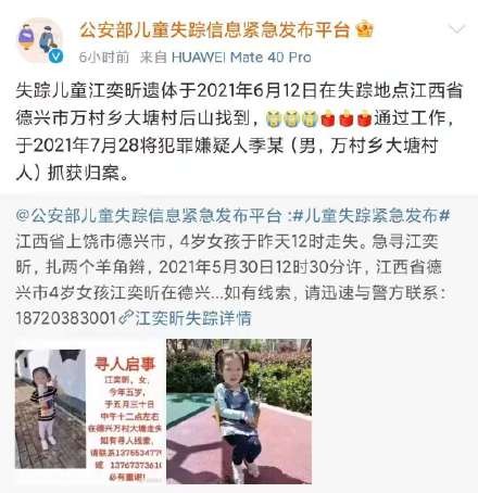 【江西4岁走失女童确认遇害嫌疑人被捕】8月10日,公安部儿童失踪信息紧急发布平台官方微博发布通报称,江西失踪女童江奕昕遗体于2021年6月12日在失踪地点江西省德兴市万村乡大塘村后山找到,于2021年7月28日将犯罪嫌疑人季某(男,万村乡大塘村人)抓获归案。就在前一天,江奕昕妈妈在社交平台发文:“相信法律是公平公正的,做恶之人必将严惩!”(扬子晚报/紫牛新闻见习记者 孙庆云)