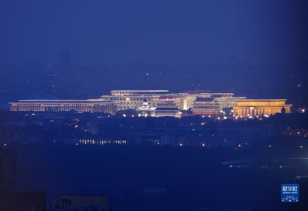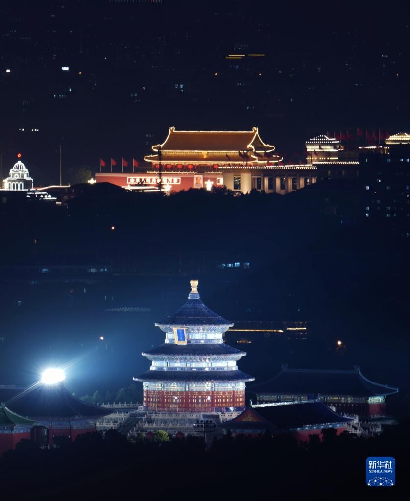 当日北京天气晴好,夜色下,地标性建筑宏伟壮观。