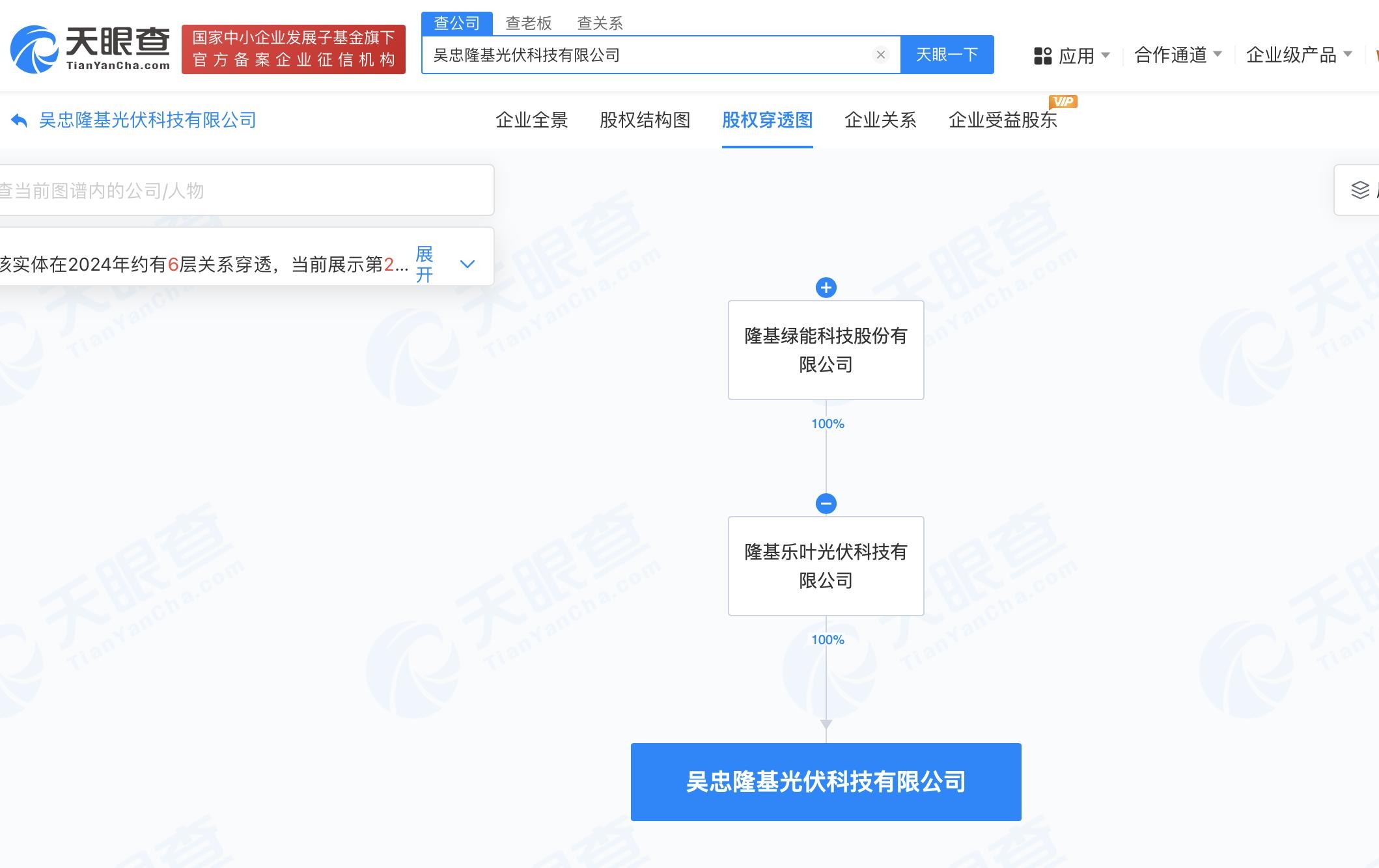 每经AI快讯,天眼查App显示,近日,吴忠隆基光伏科技有限公司成立,法定代表人为任乃俊,注册资本1000万元人民币,经营范围含光伏设备及元器件制造、电子元器件与机电组件设备销售、太阳能发电技术服务等。股权全景穿透图显示,该公司由隆基乐叶光伏科技有限公司全资持股,后者为隆基绿能(601012)全资子公司。