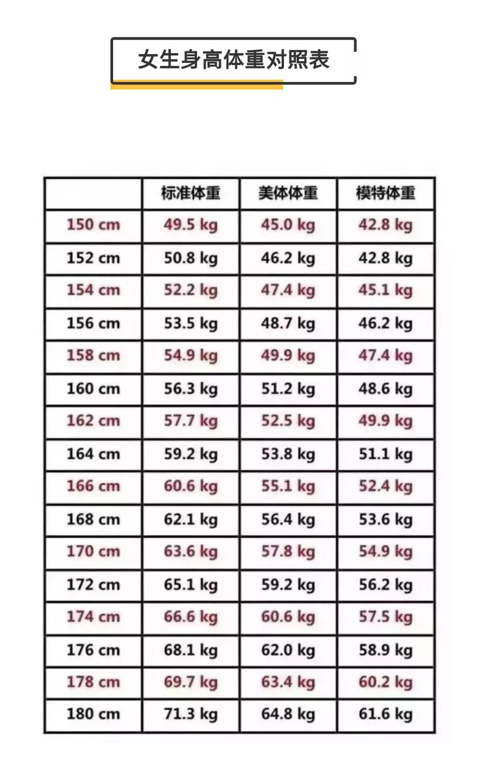 女子标准体重表