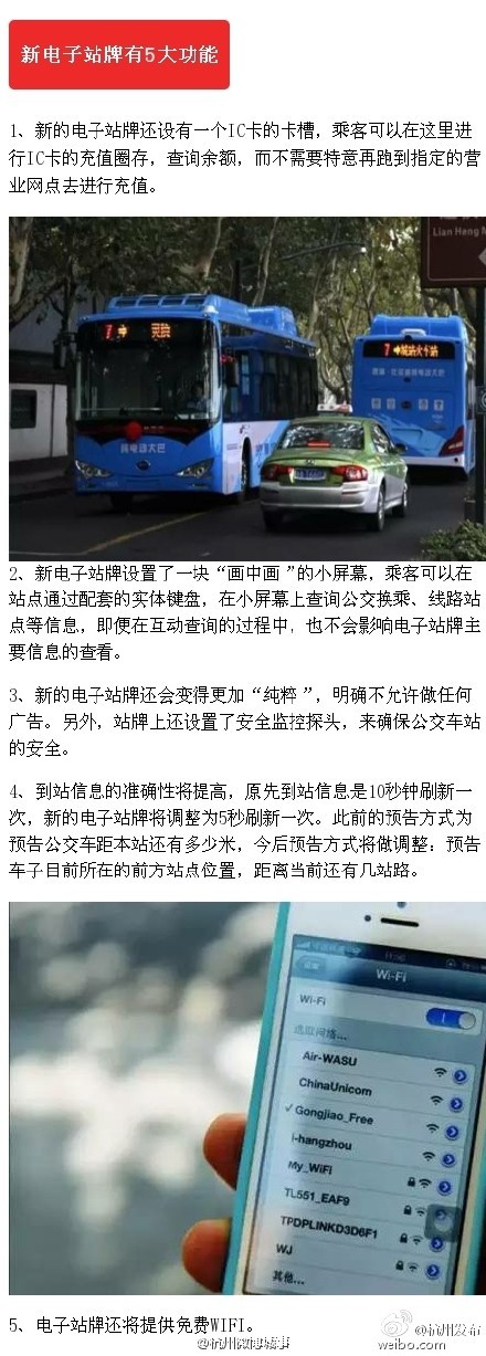 据市城管委和市公交集团,目前杭州市区614座公交站牌正在进行提升改造,涉及100座电子站牌、514座标准站牌,计划4月底完成。电子站牌不仅能直接给公交卡充值,到站信息准确性也将提高,还能提供免费WIFI。