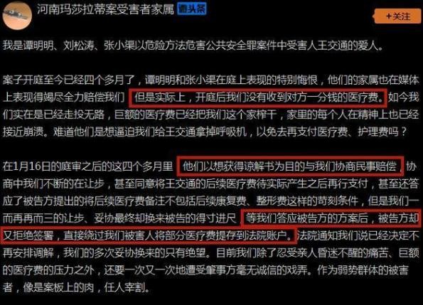 而谭家人这样做的目的也很明确,就是希望通过取得受害方的谅解书,从而替谭明明等人获得从轻量刑的机会。