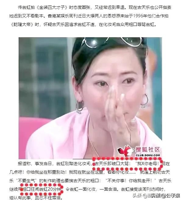 2000年,翁虹在媒体面前哭诉,在拍《乾隆大帝》时,古天乐对自己穷追不舍,自己没答应他,古天乐在化妆间对自己破口大骂。