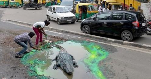 早在几年前,他也曾大开脑洞,在班加罗尔北部一个12英尺长的坑洞上,制作了一只能够以假乱真的大鳄鱼,引起公众的广泛转发,最终迫使当地政府修复了这个路面坑洞。