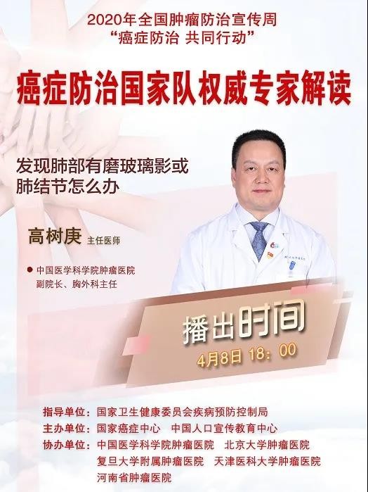编者按:4月15~21日是第26个全国肿瘤防治宣传周,今年宣传周主题是“癌症防治共同行动”,4月8日起,由国家卫生健康委员会疾病预防控制局指导,国家癌症中心和中国人口宣传教育中心主办,中国医学科学院肿瘤医院等承办的“癌症防治国家队权威科普解读”推出。本期,中国医学科学院肿瘤医院副院长、胸外科主任高树庚,讲解“发现肺部有磨玻璃影或肺结节怎么办”。