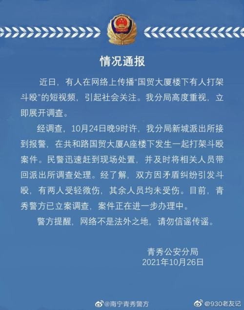 10月26日南宁市公安局青秀分局通报:近日,有人在网络上传播“国贸大厦楼下有人打架斗殴”的短视频,引起社会关注。经调查,10月24日晚9时许,青秀公安分局新城派出所接到报警,在共和路国贸大厦A座楼下发生一起打架斗殴案件。民警迅速赶到现场处置,并及时将相关人员带回派出所调查处理。经了解,双方因矛盾纠纷引发斗殴,有2人受轻微伤,其余人员均未受伤。目前,青秀警方已立案调查,案件正在进一步办理中。警方提醒,网络不是法外之地,请勿信谣传谣。
