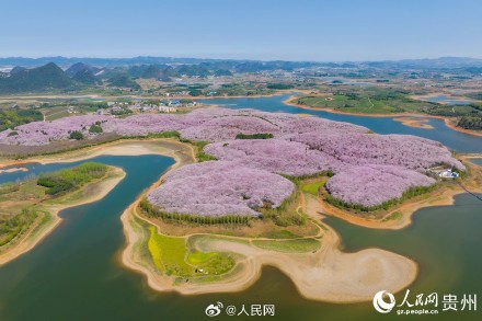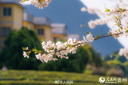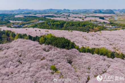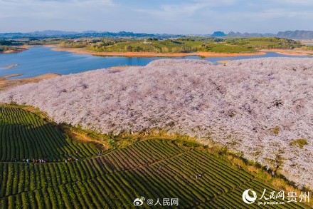 3月25日,位于贵州省贵安新区的万亩樱花园迎来一年中最美的时刻,园内70余万株樱花竞相绽放。樱花与蓝天、茶海相映成景,美不胜收。@人民网贵州频道