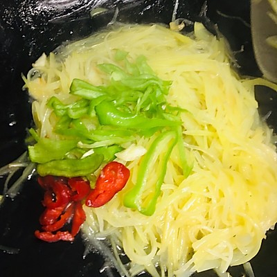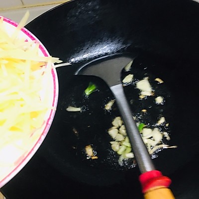 2、锅中入油放入蒜粒爆香,然后倒入土豆丝
