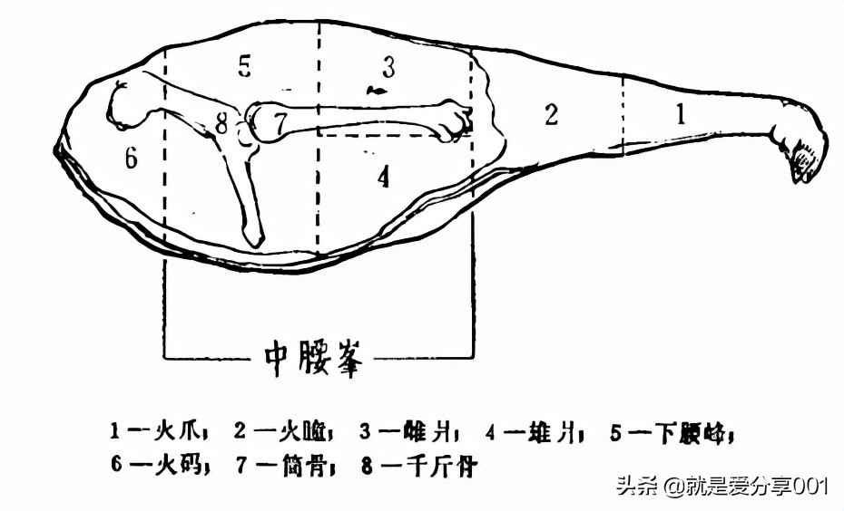 2、将压过的火腿切取雄片(如下图),四周修齐,切成宽一寸六分、厚六分(肥腰厚一分、瘦肉厚五分)地块,然后批成长一寸六分、宽六分、厚三厘的薄片四十八片(约重三丙)