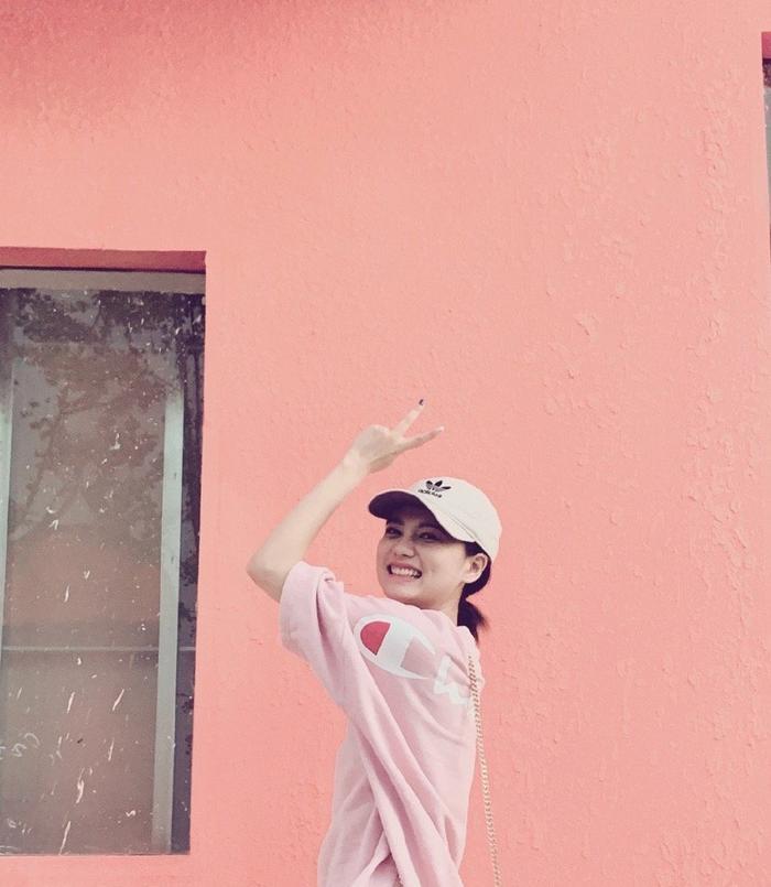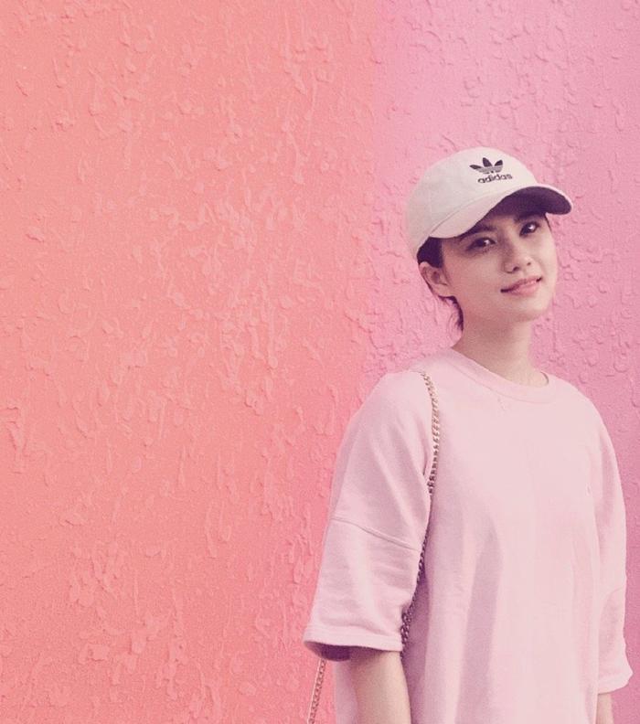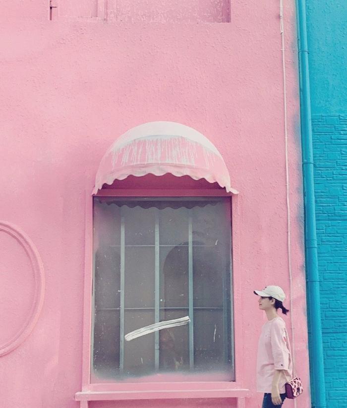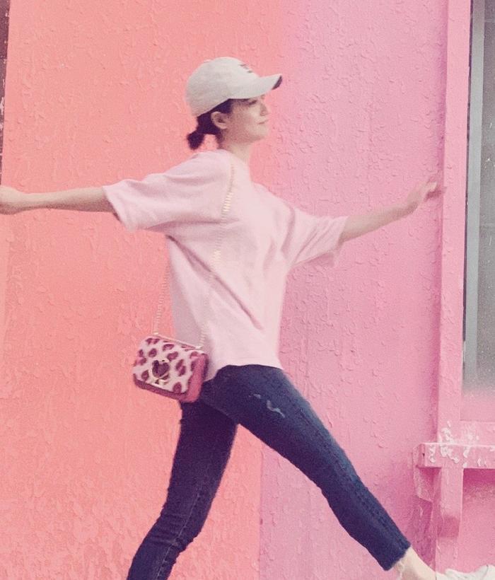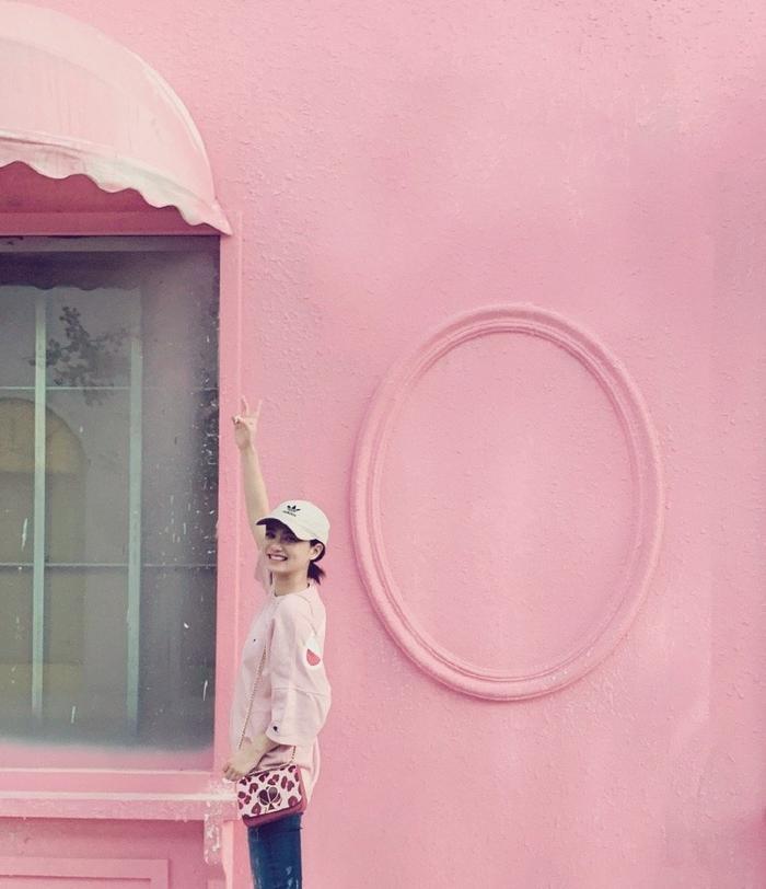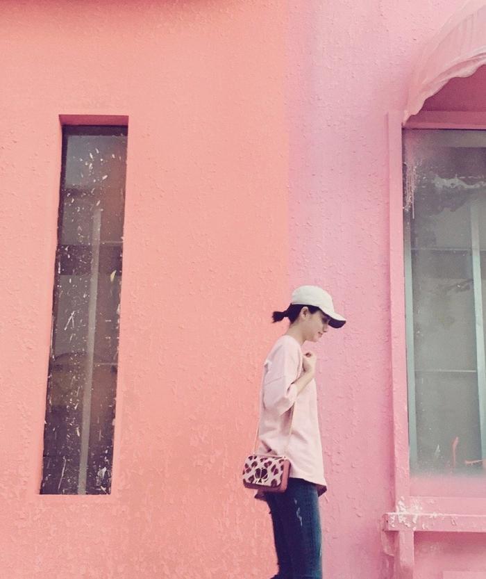 对女生而言,多少都会有一些少女心的,而粉色正好是对此的最好诠释,在这组街拍照中,25岁姜珮瑶选择了粉色T恤作为搭配,感觉与背后的粉色墙壁都融为一体了,看来我们的姐姐还是很会选地方拍照的,可见浅粉色对于皮肤白皙的女生来说,是一个不错的选择。