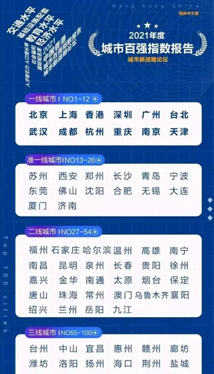 近日,由香港发布的2021年城市百强指数报告中,把全国100个城市划分为一线、二线和三线城市。