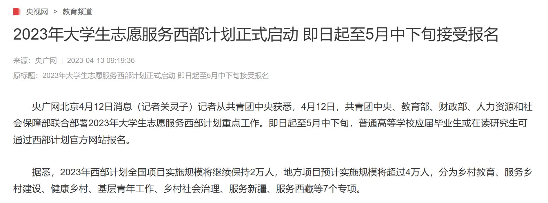 原标题:2023年大学生志愿服务西部计划正式启动 即日起至5月中下旬接受报名