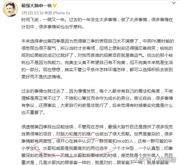 另外,申一帆在3月3日晚上发的这条宣布自己退赛的微博,他在微博里提到了自己最喜欢、最欣赏的两位选手,一个是王昱珩,一个是李威。基本上只要是最强大脑的选手发的微博,很少或者根本就不会提到王峰,也不会@他。